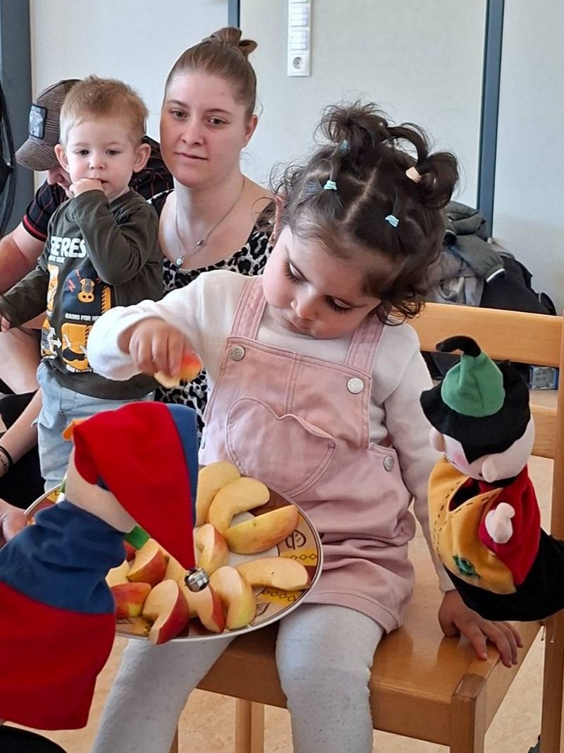 Viele Familien folgten unserer Einladung und erlebten ein liebevoll gestaltetes Kasperletheater mit Kasperl und dem Räuber. Die Kinder fieberten gespannt mit und freuten sich besonders über das gemeinsame Ende, bei dem der gestohlene Apfel wieder zurückgegeben und miteinander geteilt wurde.